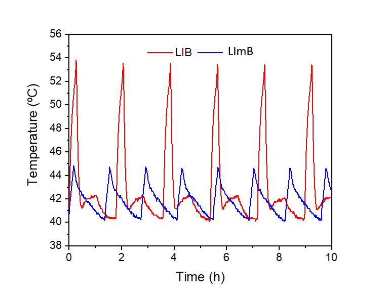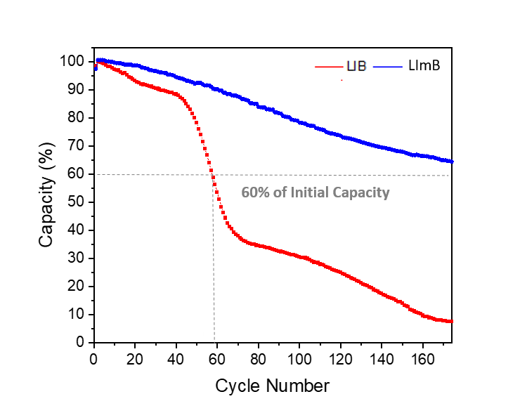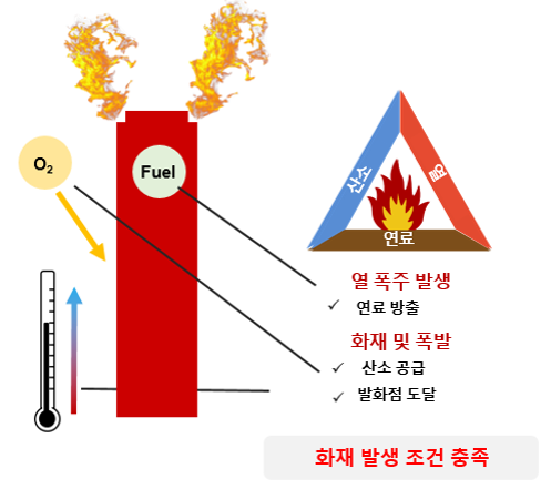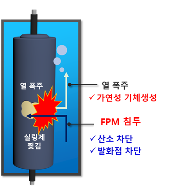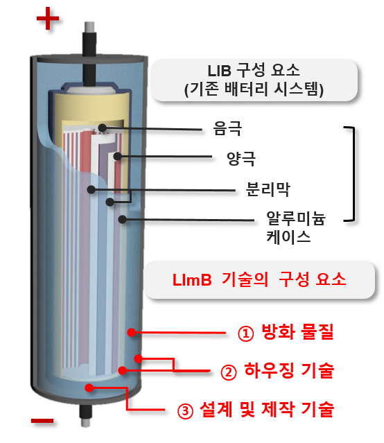1 Liquid Immersion Battery LImB 설명 Liquid Immersion Battery (LImB) 기존 리튬이온배터리의 화재 위험성 및 고온에서 수명 저하 문제를 해결하기 위해 새로운 냉각 및 방화 시스템을 적용한 신개념 배터리입니다. 방화물질과 다중층 실링기술을 접목하여 정상 작동 시에는 배터리의 발열을 흡수 및 장수명을 유지하고, 열폭주와 같은 비상 상황 시에는 화재를 즉각 진압하며 화재의 전이를 방지합니다. 화재 발생 3요소(산소, 발화점, 가연물) LImB의 핵심 구성요소 LImB의 화재 차단 원리 LImB 핵심기술 정상 구동 시 열 관리 리튬이온배터리는 정상 구동 시에 열이 발생하며 특히 고출력 방전 시 발열은 더욱 증가합니다. 이로 인해 배터리 온도가 증가 시 열화현상이 촉진되어 수명이 급격히 감소합니다. 하지만 LImB는 방화물질의 높은 비열 및 열전도도로 배터리의 발열을 효율적으로 흡수하여, 열관리 효과를 통한 장수명 유지가 가능합니다. LIB 대비 LImB의 열관리 효과로 인한 수명 증대 열 폭주 시 화재 진압 및 전이 차단 리튬이온배터리의 가장 심각한 문제는 높은 에너지밀도와 밀집되어 있는 구조로 인해 열 폭주 시 대형화재 위험이 크다는 것입니다. LImB는 방화물질이 화재의 3요소 중 산소와 발화점을 차단하여 즉각적으로 화재가 진압되며, 인접 배터리로의 화재 전이를 방지합니다. 일반 LIB 모듈 (좌) LImB 모듈 (우) 화재 테스트