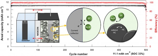 Seawater batteries (SWBs) emerge as the next generation of energy storage systems owing to their high potential energy densities. However, they suffer from low practical energy densities. Utilizing an open-structured cathode that leverages the unlimited supply of sodium ions from seawater, SWBs are inherently limited in energy density owing to the capacity of the anode. To maximize the amount of active material in a limited anode space, efforts with highly loaded electrodes present challenges in terms of sufficient reversibility, while liquid electrodes have low capacity, requiring alternative methods. To enhance the energy density of the SWB anode, this study employs the “redox targeting” method, which has been used to enhance the energy density in redox flow battery systems. Redox targeting is achieved by combining a hard carbon (HC) active material and a sodium biphenyl (Na-BP) redox mediator in a semi-liquid form. The proposed HC and Na-BP semi-liquid electrode (HCBP-SLE) demonstrates high areal energy density and stable performance. It achieves a capacity of 11.1 mAh cm−2 (=1 Ah) over 500 cycles (equivalent to 5000 h) in a SWB. Using this method, we achieve successful mass production of HCBP-SLE and its application in SWBs, demonstrating its potential for industrial utilization.