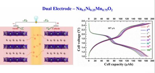 Sodium-ion batteries are now close to replacing lithium-ion batteries because they provide superior alternative energy storage solutions that are in great demand, particularly for large-scale applications. To that end, the present study is focused on the properties of a new type of dual-electrode material, Na0.5Ni0.25Mn0.75O2, synthesized using a mixed hydroxy-carbonate route. Cyclic voltammetry confirms that redox couples, at high and low voltage ranges, are facilitated by the unique features and properties of this dual-electrode, through sodium ion deintercalation/intercalation into the layered Na0.5Ni0.25Mn0.75O2 material. This material provides superior performance for Na-ion batteries, as evidenced by the fabricated sodium cell that yielded initial charge–discharge capacities of 125/218 mAh g–1 in the voltage range of 1.5–4.4 V at 0.5 C. At a low voltage range (1.5–2.6 V), the anode cell delivered discharge–charge capacities of 100/99 mAh g–1 with 99% capacity retention, which corresponds to highly reversible redox reaction of the Mn4+/3+ reduction and the Mn3+/4+ oxidation observed at 1.85 and 2.06 V, respectively. The symmetric Na-ion cell, fabricated using Na0.5Ni0.25Mn0.75O2, yielded initial charge–discharge capacities of 196/187 μAh at 107 μA. These results encourage the further development of new types of futuristic sodium-ion-battery-based energy storage systems.