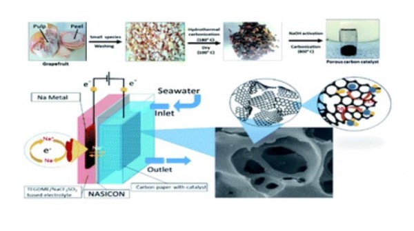 Low-cost oxygen evolution/reduction reaction (OER/ORR) catalysts are critically important for energy conversion/storage systems. Here, a porous carbon (PC) catalyst is prepared as a low-cost catalyst from grapefruit peels biowaste using a facile hydrothermal carbonization combine with a chemical activation process. When examined as OER/ORR catalysts in seawater, the PC exhibits an unexpected, highly efficient catalytic activity. From density functional theory (DFT) calculations, we found that sp3-bonded carbon atoms, zigzag edges with or without –COOH and –OH, and armchair edges with C-O-C are responsible for the superior activity of OER/ORR. The suitability of the PC as a catalyst is tested in the half-cell of a Na/Seawater battery, which exhibits a decreased voltage gap of ∼0.47 V between charge and discharge voltage curves. This value is even lower than that of Pt/C (∼0.68 V), IrO2 (∼0.66 V) and MnO2 (∼0.73). Also, a full cell of the metal-free seawater battery is assembled using hard carbon and PC as anode and catalyst, respectively. The full cell shows a lower voltage gap (∼0.65 V) with the voltage efficiency of ∼83-84% and excellent cycle life over 100 cycles. Our result confirms PC derived from grapefruit peels as an alternative to expensive Pt/C and IrO2 catalysts for the OER/ORR activities in seawater battery.