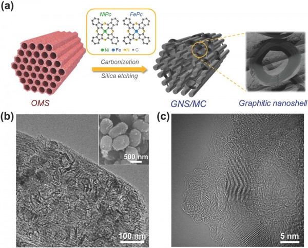 Efficient and cost-effective bifunctional electrocatalysts for oxygen evolution reaction (OER) and oxygen reduction reaction (ORR) are of vital importance in energy conversion and storage devices. Despite the recent progress in bifunctional oxygen electrocatalysts, their unbalanced and insufficient OER and ORR activities has continued to pose challenges for the practical application of such energy devices. The design of highly integrated, high-performance, bifunctional oxygen electrocatalysts composed of highly graphitic nanoshells embedded in mesoporous carbon (GNS/MC) is reported. The GNS/MC exhibits very high oxygen electrode activity, which is one of the best performances among nonprecious metal bifunctional oxygen electrocatalysts, and substantially outperforms Ir- and Pt-based catalysts. Moreover, the GNS/MC shows excellent durability for both OER and ORR. In situ X-ray absorption spectroscopy and square wave voltammetry reveal the roles of residual Ni and Fe entities in enhancing OER and ORR activities. Raman spectra indicate highly graphitic, defect-rich nature of the GNS/MC, which can contribute to the enhanced OER activity and to high stability for the OER and ORR. In aqueous Na–air battery tests, the GNS/ MC air cathode-based cell exhibits superior performance to Ir/C- and Pt/C based batteries. Significantly, the GNS/MC-based cell demonstrates the first example of rechargeable aqueous Na–air battery.
