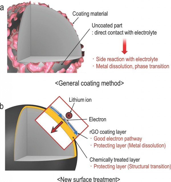 The Li-rich cathode materials have been considered as one of the most promising cathodes for high energy Li-ion batteries. However, realization of these materials for use in Li-ion batteries is currently limited by their intrinsic problems. To overcome this barrier, a new surface treatment concept is proposed in which a hybrid surface layer composed of a reduced graphene oxide (rGO) coating and a chemically activated layer is created. A few layers of GO are first coated on the surface of the Li-rich cathode material, followed by a hydrazine treatment to produce the reducing agent of GO and the chemical activator of the Li2MnO3 phase. Compared to previous studies, this surface treatment provides substantially improved electrochemical performance in terms of initial Coulombic effiency and retention of discharge voltage. As a result, the surface-treated 0.4Li2MnO3–0.6LiNi1/3Co1/3Mn1/3O2 exhibits a high capacity efficiency of 99.5% during the first cycle a the discharge capacity of 250 mAh g−1 (2.0–4.6 V under 0.1C), 94.6% discharge voltage retention during 100 cycles (1C) and the superior capacity retention of 60% at 12C at 24 °C.