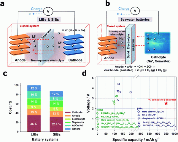 A new energy conversion and storage system, named the ‘seawater battery’, has recently been the subject of research in the field of electrochemistry. Using natural seawater as the catholyte in an open-structured cathode, the battery stores sodium (Na) ions from the seawater into the anode side during charging, and then delivers electricity by discharging on demand. Herein, we report on an amorphous red phosphorus/carbon composite anode material which was successfully employed as the anode of a seawater battery. It exhibited a stable cycling performance with a high reversible capacity exceeding 920 mAh g-1composite with a coulombic efficiency of more than 92% over 80 cycles, as well as good rate capabilities. In terms of the full-cell performance of lithium ion and sodium ion batteries, the seawater batteries with the amorphous red phosphorus/carbon composite anode exhibited the highest reversible capacity and energy density. These results indicate that the use of an open-structured cathode system, which provides the anode with an unlimited supply of Na ions, would allow a seawater battery to overcome the limitations associated with the high-capacity alloying reaction-based anodes used in conventional batteries with a closed system.