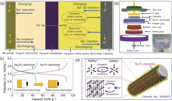 We describe a new strategy to increase charge storage in a dual electrolyte Na-ion battery (DESIB) by combining the redox chemistry of the electrolyte with a Na+ ion de-insertion/insertion cathode. Conventional electrolytes do not contribute to charge storage in battery systems, but redox-active electrolytes augment this property via charge transfer reactions at the electrode-electrolyte interface. Hence, the capacity of the cathode combined with that provided by the electrolyte redox reaction increases overall charge storage. We employ an aqueous sodium hexacyanoferrate (Na4Fe(CN)6) solution as the redox-active electrolyte (Na-FC) and sodium nickel Prussian blue (Nax-NiBP) as the Na+ ion insertion/de-insertion cathode. The capacity of DESIB with Na-FC electrolyte is twice that of a battery using conventional (Na2SO4) electrolyte. The use of redox-active electrolytes in batteries of any kind is an efficient and scalable approach to develop advanced high-energy-density storage systems.
