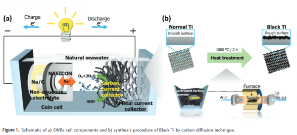 Seawater batteries (SWBs) are a type of sodium-air batteries that use abun-dant seawater as the source of the catholyte. A cathode current collector in traditional SWBs is composed of titanium (Ti) and carbon-based current collectors. The high contact resistance between Ti and carbon-based cur-rent collectors as well as the slow kinetics of oxygen evolution and reduc-tion reactions increase the overpotential, resulting in side reactions such as carbon corrosion. To enhance the performance of SWBs, previous studies have focused on carbon current collectors, catalysts, and polymer binders, while ignoring the importance of Ti. In this study, a facile carbon diffusion technique is employed to successfully form titanium carbide (TiC) on the surface of Ti. SWBs with engineered Ti demonstrate considerably improved performance (four times higher cycling stability, 30% increased power perfor-mance, 40% reduced voltage gap) in relation to those with pristine Ti. This significantly improved electrochemical performance is found to be attribut-able to the prevention of carbon corrosion due to i) the reduction of contact resistance (owing to rough TiC surface) and ii) the electrocatalytic effect of TiC. Finally, engineered Ti is applied to large-area SWBs and its potential applicability in energy storage systems is confirmed.