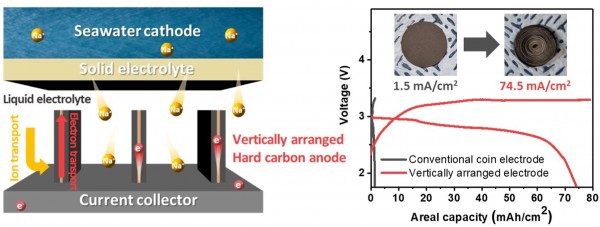 Seawater batteries (SWBs) have attracted considerable attention as next-generation batteries owing to their high theoretical energy density and low cost. However, the practical energy density of SWBs is lower than that of conventional sodium-ion batteries as they contain a solid electrolyte with thickness limitations and inflexible mechanical properties. Considering the structure of SWBs, an increase in the anode thickness is required; however, the conventional high-mass-loading approaches are constrained by electrochemical and physical characteristics such as sluggish ion diffusion and delamination. In this study, we report the vertical arrangement of a conventional electrode to overcome the structural instability of the thick electrode and enable facile ion and electron transport by generating a vertically arranged electrode structure (VAES), which is verified using 3 different factors namely, vertical thickness, electrode compactness, and vertical angle. The electrode structures applied to the SWB anode exhibit a specific capacity of approximately 220 mAh/g over 100 cycles, achieving a high areal capacity of 75 mAh/cm2 in the coin cell, which is 50 times higher than that of a single-sheet electrode. This study demonstrates an efficient strategy to increase the energy density of SWB and provides valuable insights into the electrochemical characteristics of vertical electrode systems.