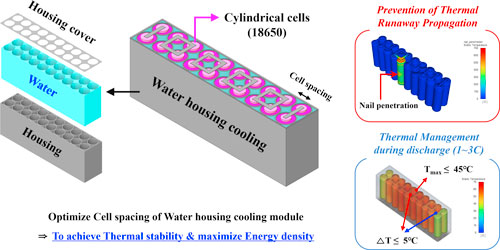 Lithium-ion batteries (LIBs), due to their high energy density, long lifespan, and low self-discharge, are widely used in various applications. However, they are challenged by the risk of thermal runaway and thermal degradation, so they require effective thermal management system. In this study, we investigated the application of a water-inclusive housing structure to battery modules to prevent thermal runaway propagation and enhance thermal management. The thermal and electrochemical behaviors of the batteries were analyzed using the ANSYS Fluent simulator. Through simulations, we determined the optimal cell spacing of the water-housing module that maximizes energy density while ensuring thermal stability. Our results indicate that a water housing module composed of 20 cylindrical cells(10s2p) with a cell spacing of 4 mm can effectively prevent thermal runaway propagation and reduce cell temperature by approximately 60% during normal discharge, while maintaining 80% of the volumetric energy density of a conventional module. Furthermore, the reliability of our simulation results was validated through thermal runaway and normal discharge tests. The proposed water housing method holds great promise in preventing thermal runaway propagation and enhancing thermal stability of LIB modules, thereby mitigating the risk of fire and thermal degradation during normal discharge