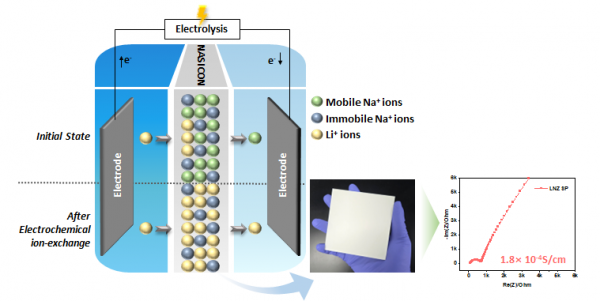 As the demand for high-performance and safer batteries continues to grow, solid electrolytes are emerging as essential alternatives to conventional liquid electrolytes, which are prone to leakage, flammability, and thermal runaway. Among various candidates, NASICON-type materials have garnered significant attention because of their high ionic conductivity, low cost, and high chemical stability under ambient conditions. However, Li+ conducting NASICON-type solid electrolytes are limited by interfacial instability, primarily owing to reduction reactions at the interface. To address this issue, researchers have attempted to replace Ti with the more stable Zr-based frameworks. However, the direct synthesis of Li-based Zr-NASICON structures via traditional solid-state methods remains challenging and often results in poor phase purity or low ionic conductivity. In this study, we propose a novel “electrochemical ion-exchange” process to convert Na+ conducting NZSP (Na3Zr2Si2PO12) into Li+ conducting LNZSP (LixNa3−xZr2Si2PO12) at room temperature. Electrochemical and elemental analyses confirm the successful incorporation of Li+, and the resulting material exhibited enhanced ionic conductivity (≈1.8 × 10−4 S cm−1 at room temperature) among oxide electrolytes that are stable in air and moisture. This straightforward electrochemical approach not only improves ionic transport in NASICON-type electrolytes, but also offers a scalable and energy-efficient pathway for next-generation solid-state electrolyte technologies.